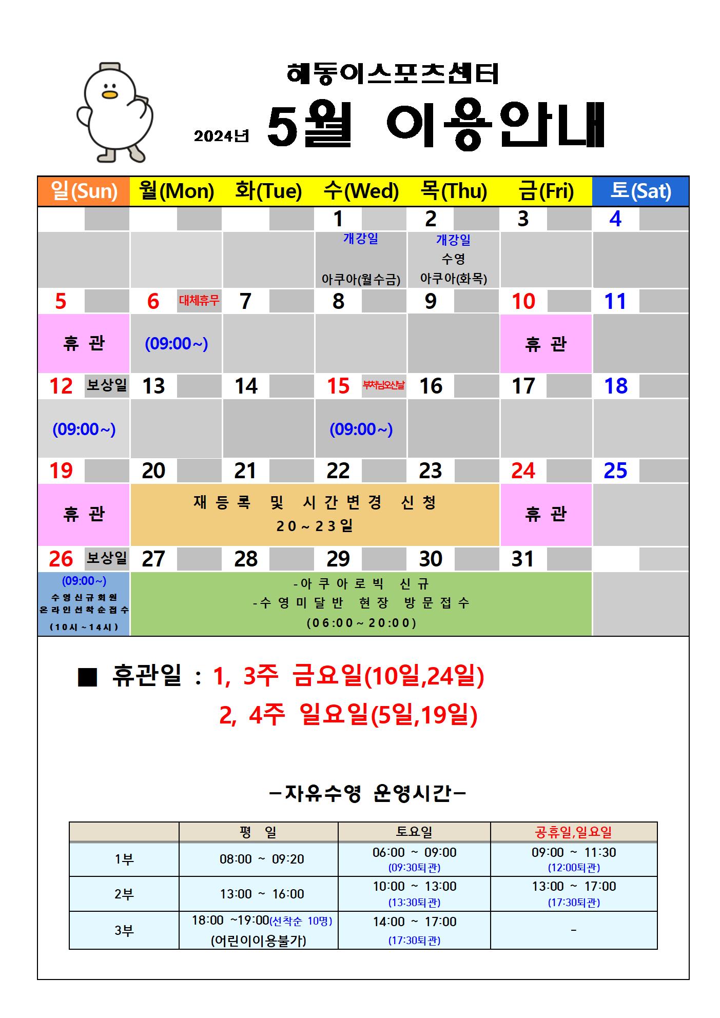 해동이스포츠센터 5월 수영 신규회원 미달강습반 및 아쿠아로빅 모집인원을 붙임과 같이 안내합니다. 확인하시고 등록 하시기 바랍니다 신청일시 : 27일 06:00 ~ 30일 20:00까지 (선착순 현장 방문접수) * 첨부파일을 확인하시고 접수하시기 바랍니다.