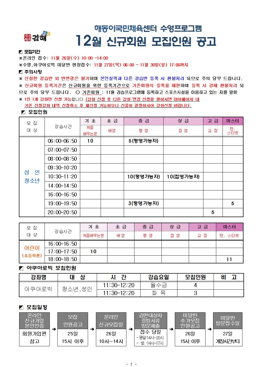 공지  12월 해동이국민체육센터 수영,아쿠아로빅 신규회원모집 인원 안내