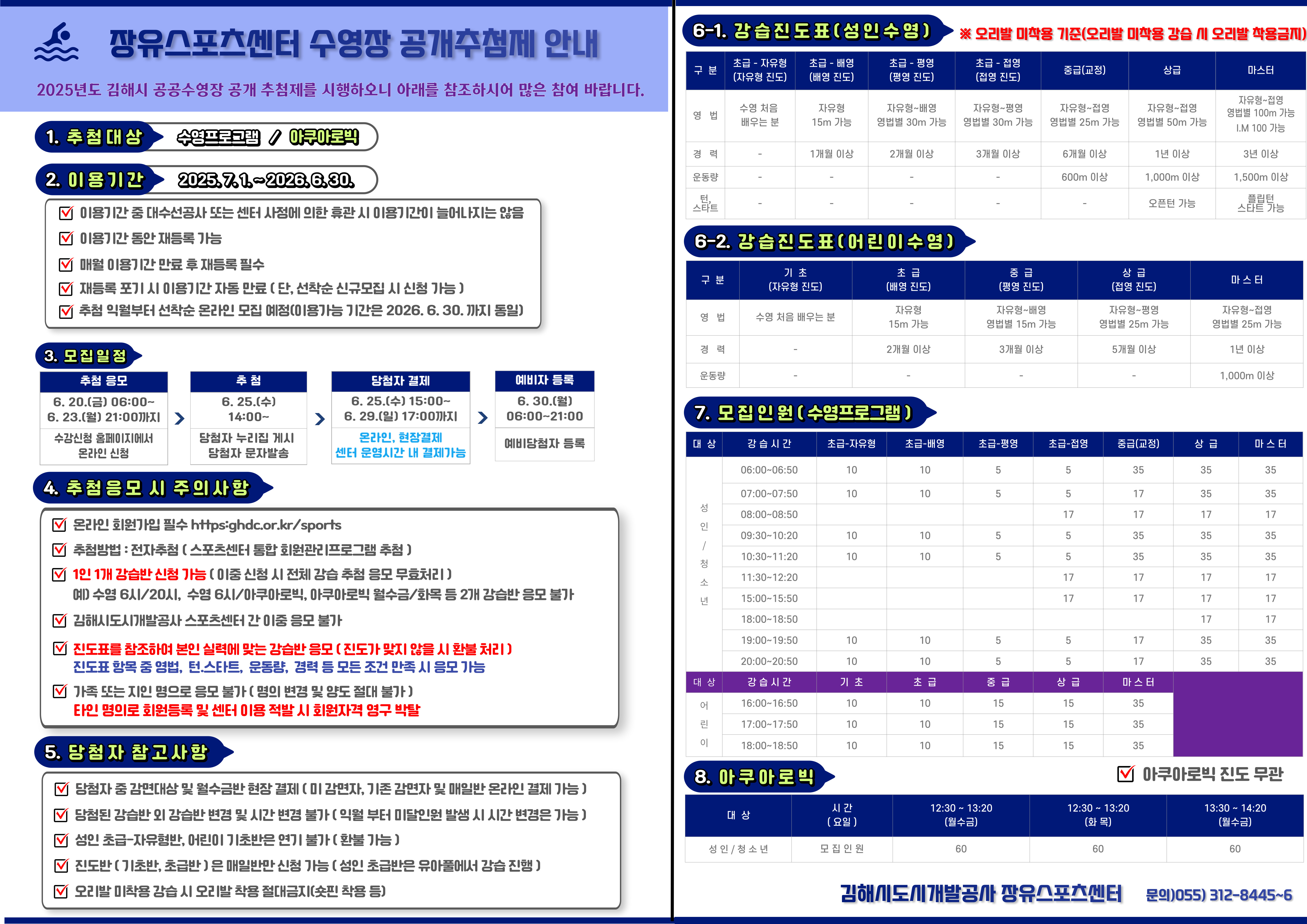 2025년 7월 김해시 공공수영장 공개 추첨제를 시행하오니 첨부파일을 참조하시어 많은 이용 바랍니다.